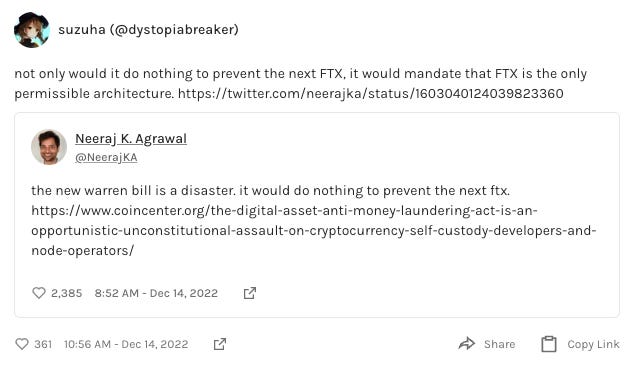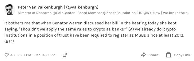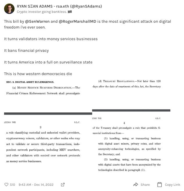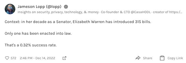 Senator Elizabeth Warren and Senator Roger Marshall introduce a bill that feels like an attack on crypto. It’s stated to come from the FTX collapse, when in fact, it wouldn’t have protected anyone from something like FTX. Hopefully her success rates on getting bills into law stays on par. What a shame