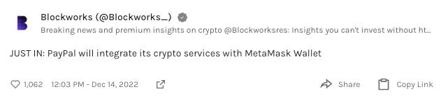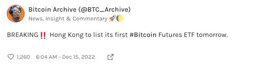 It’s really encouraging to see that not every project or person in crypto is letting the FTX collapse stop them from building. There are still amazing things happening in crypto. A Bitcoin Futures ETF goes live tomorrow in Hong Kong. PayPal integrates MetaMask. Two Senators introduce a bill that’s absolutely garbage for crypto. Kevin O’Leary blamed Binance for FTX collapse.