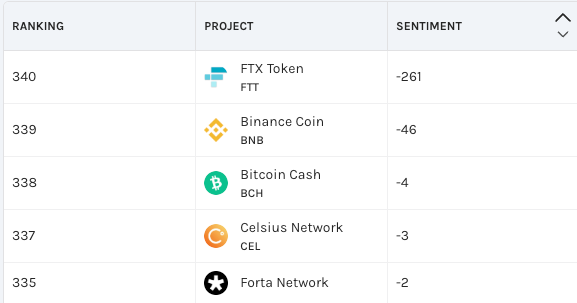 These are the most negative coins today on crypto twitter. It is updated hourly at Twitter sentiment ranking page bottoms